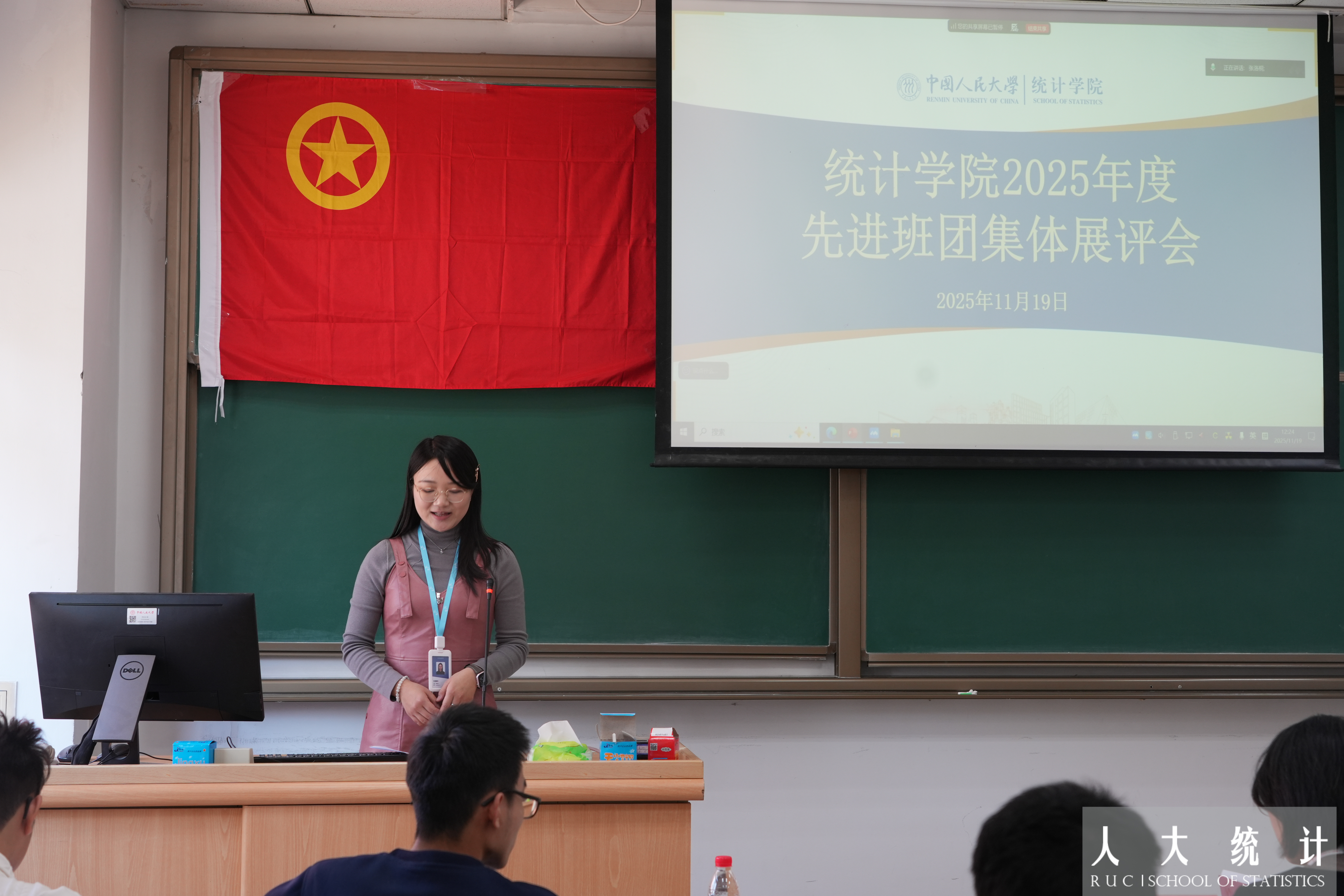 时间:2025-11-212025 年11月19日下午,统计学院在明德商学楼0105教室召开2025年度先进班团集体展评会。统计学院党委副书记、纪委书记金驰华,团委书记徐澜玲,团委副书记杨馥祯,专职辅导员吴宇浩,班主任代表巩一瑾出席活动并担任评委。统计学院团委学生兼职副书记王晓鹏,研究生会主席团成员蔡梓怡共同担任学生评委,各班级的班团骨干列席观摩。展评会由徐澜玲主持。