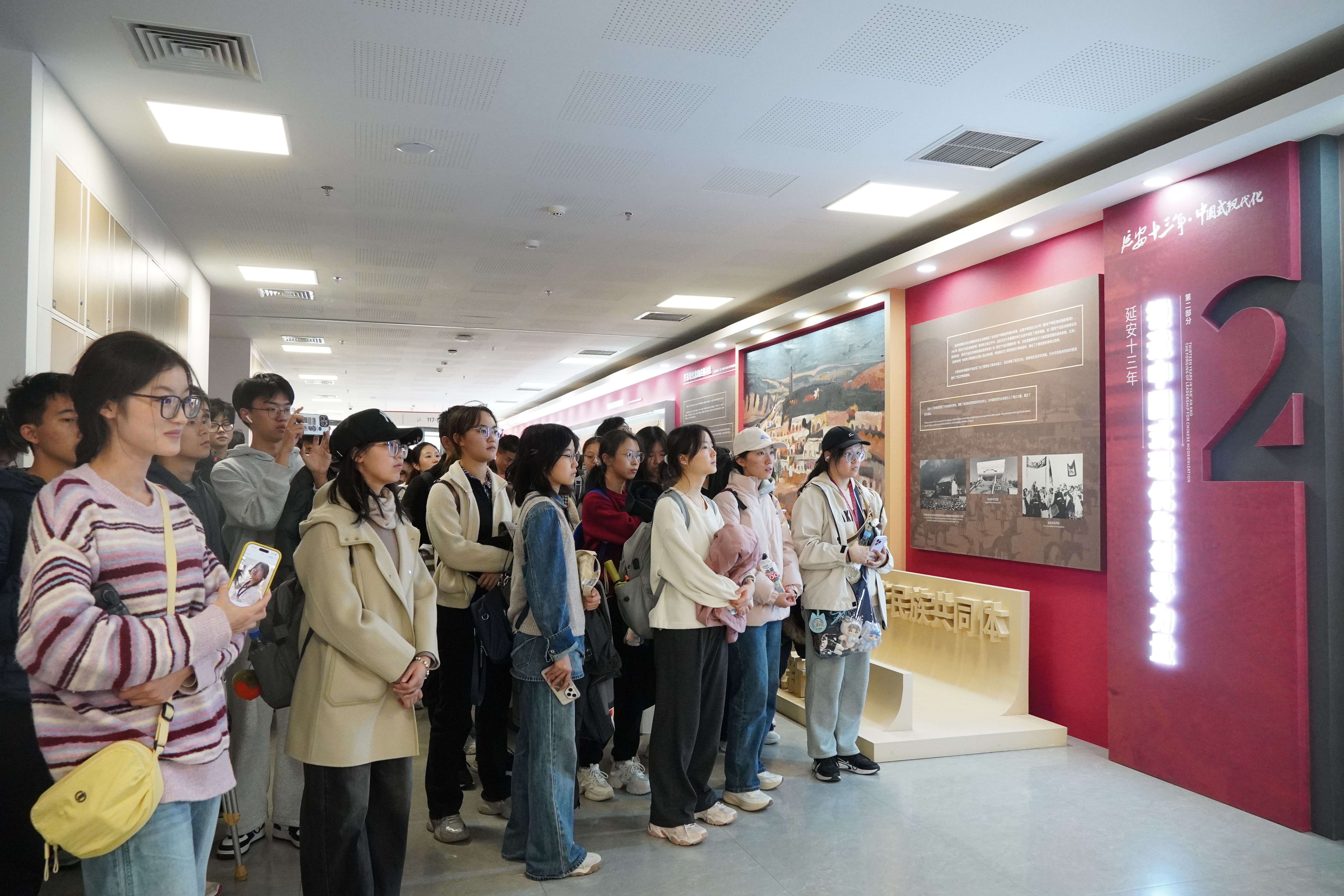 随后,大家走进“延安十三年与中国式现代化”主题展馆与校史馆。志愿者以历史脉络为轴,系统梳理了中国共产党在抗日战争时期的中流砥柱作用、改革开放以来的跨越式发展历程,深刻阐释了中国共产党作为中国式现代化核心孕育者与关键推动者的核心逻辑,同时也回顾了中国人民大学从建校伊始到跻身世界一流大学建设行列的奋斗历程。通过对馆内珍贵史料与先辈事迹的解读,学员们在历史与现实的交汇中汲取精神养分,进一步提升了对学校构建马克思主义理论学科群的宏伟规划与“为党育人、为国育才”的崇高使命的认知和理解。